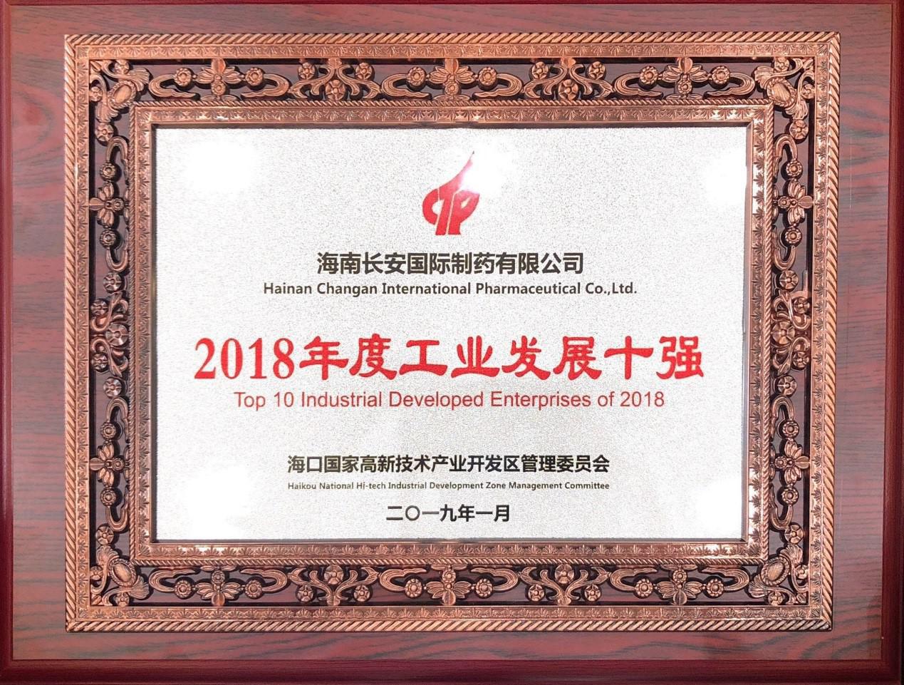 大會對科技進度與提質增效這兩方面表現突出的企業進行表彰,海南長安國際制藥有限公司榮獲“2018年工業發展十強”“2018年發展潛力之星”、、“2018年醫藥單品種銷售收入六強”稱號。